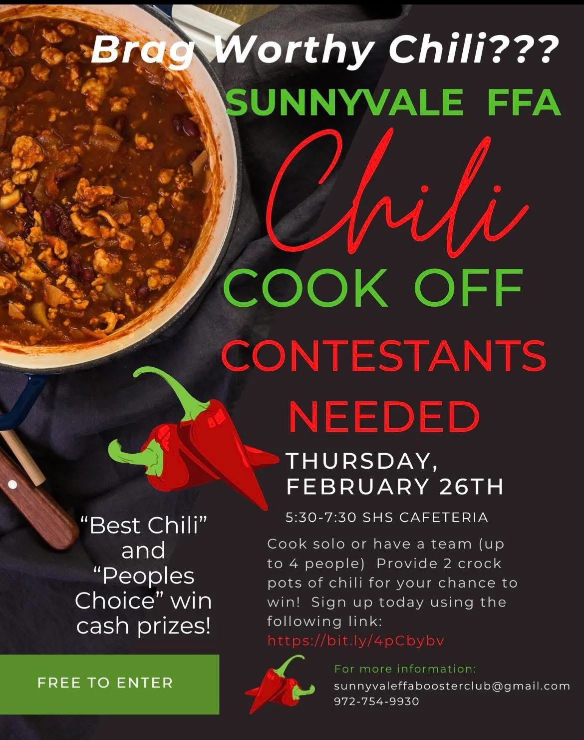 Get ready to stir, simmer, and spice things up — all for a great cause. The Sunnyvale ISD FFA Booster Club is calling on local chefs, amateur cooks, and community supporters to participate in its annual chili cook-off on Thursday, February 26. This is the Booster Club’s biggest fundraiser of the year.